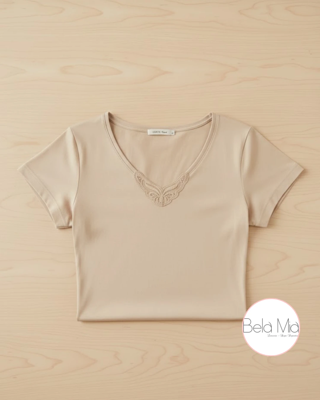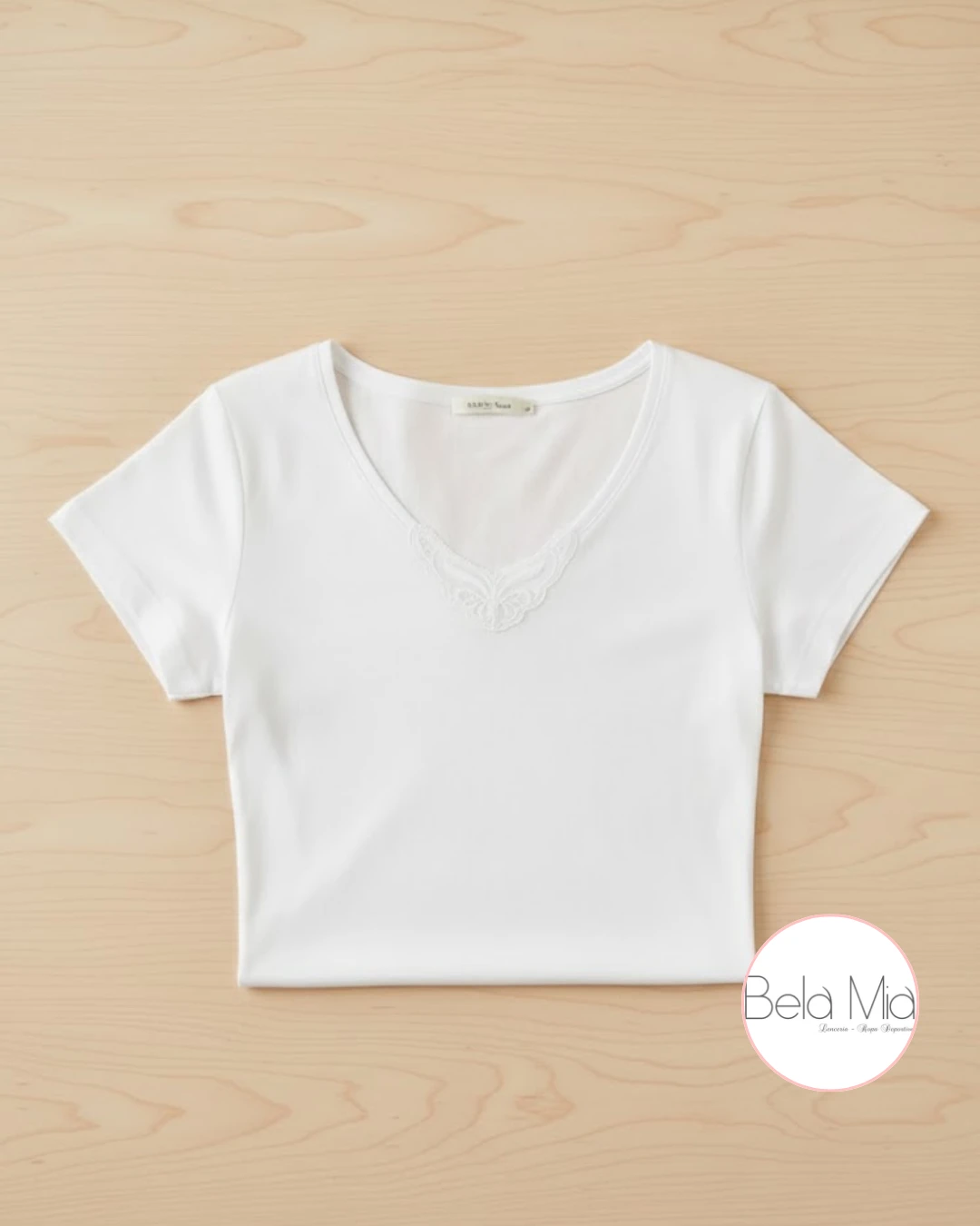 Camiseta de Algodón con Aplique – Blanca y Beige